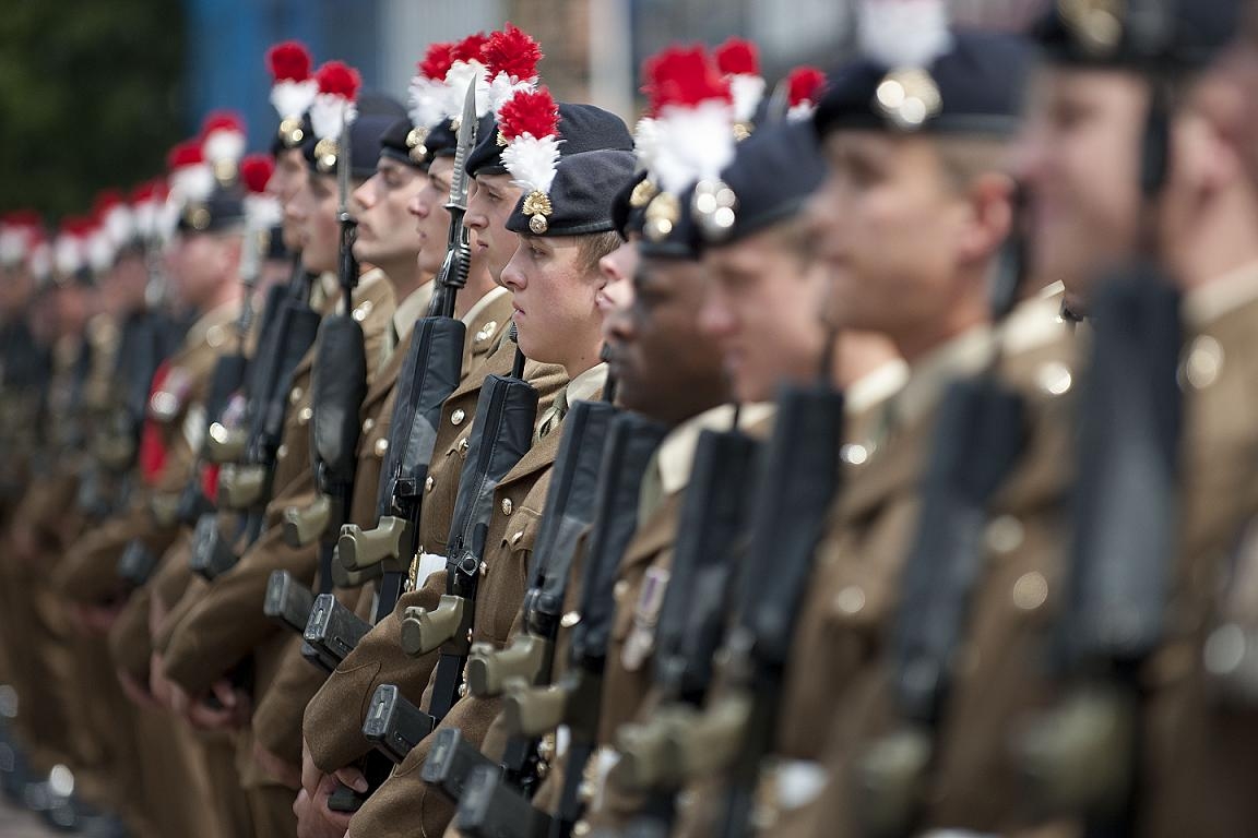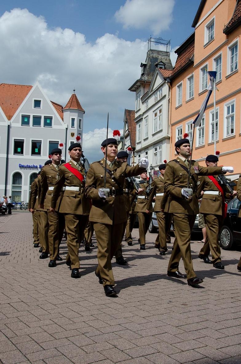 Thousands of British and German spectators lined the streets of Celle on Friday 6 July, as 2 RRF exercised their right to march through the town 'with bayonets fixed, drums beating, and colours flying' for the last time at the Unit's Freedom of Celle Parade - the last time that the Unit would do so before their departure to Cyprus at the end of July. The parade was especially poignant as the Battalion had just received the very bad news that they will be amalgamated into the rest of The Royal Regiment of Fusiliers at the end of their current operational commitments in autumn 2014, as part of the Army 2020 announcement. Spirits, however, remained high as the sun poured onto the Stechbahn plaza, and the Anglo-German crowd cheered the soldiers on as they paraded past. A host of British and German dignitaries attended the parade, including Chief of the General Staff (CGS) General Sir Peter Wall KCB CBE ADC Gen; GOC 1 Div Major General James Bashall CBE; Brigadier James Richardson MBE, Commander Germany Garrisons; Brigadier Paul Nanson MBE, Commander 7th Armoured Brigade; Brigadier David Paterson OBE, Colonel of The Royal Regiment of Fusiliers; the Regimental Secretary of The Royal Regiment of Fusiliers, Brigadier (Retd) Ian Liles OBE; Colonel Paul Eaton, Deputy Commander Bergen-Hohne Garrison; the British Ambassador to Germany, Simon McDonald CMG; Lower Saxony's Minister President, David McAllister; Federal Members of Parliament Herr Henning Otte and Frau Kirsten Lühmann; and the Oberburgermeister (Lord Mayor) of Celle, Herr Dirk-Ulrich Mende. Bundeswehr (German Army) representation came from Brigadier General Karsten Jacobson, Brigadier General Axel Binder, and Brigadier General Wolfgang Brüschke, Deputy District Commander for Military District I. As symbols of the lasting friendship between the British and German authorities, gifts were exchanged between the Battalion, 7th Armoured Brigade, and the Stadt of Celle, with the Battalion also receiving the Fahnenband of the Federal Republic of Germany from Brigadier Brüschke - a decoration for the colours equivalent to a British battle honour. Herr Mende, the Oberburgermeister (Lord Mayor) of Celle, spoke cordially of the relationship between the two countries, noting how miraculous it was for such a friendship to have developed in the aftermath of World War II. His final words were: "Good luck to you, Auf Wiedersehen, goodbye, God save the Queen." Lower Saxony's Minister President, David McAllister, also praised the Anglo-German relationship, saying: "Today is a day which fills us with sadness, pride and gratitude." Following their inspection by CGS, The Colonel and Minister President McAllister, and led by their Corps of Drums, the Battalion set off marching through the town to the applause of the crowd.