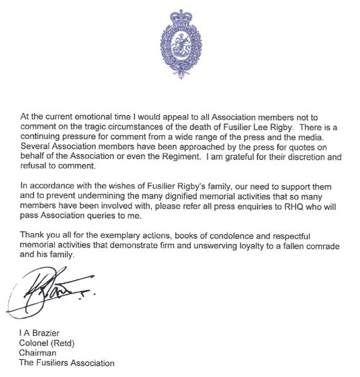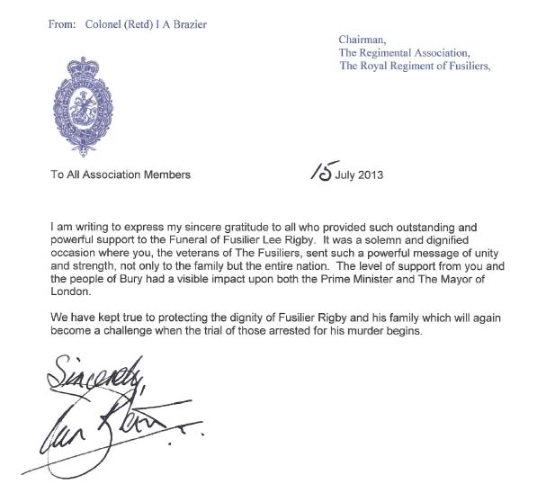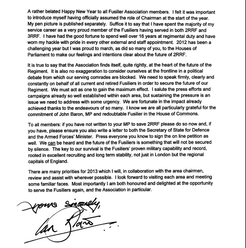 Ian Brazier was commissioned into The Second Battalion, The Royal Regiment of Fusiliers in June 1975, as they prepared to move to Paderborn. He remained with 2RRF in Germany and in various tours of Ireland including the residential tour at Palace Barracks. He served as a Platoon Commander and Company Second in Command in A Company for 4 years and was appointed Adjutant in Hemer, remaining in post until Berlin, where he commanded B Company. After the 2RRF Falklands deployment, having completed nearly 10 years with the battalion, he was posted to the appointment of Chief Instructor (Urban) at the Northern Ireland Training Advisory Team (NITAT) UK, before attending The Army Staff College. He then served as Chief of Staff, Berlin Infantry Brigade. Thereafter he assumed command of C Company 3 RRF in Cyprus and Catterick after which he returned, for a period, to 2RRF as Bn 2IC. He was promoted to Lt Col and appointed Chief of Intelligence in the Ace Rapid Reaction Corps (HQ ARRC) in Germany and Bosnia. He commanded the Joint Support Unit at SHAPE Headquarters and returned to HQ ARRC as Chief G1 in Kosovo. After 2 years in what was St George's Barracks, Sutton Coldfield on force support restructuring and contracting. He was promoted to Colonel and assumed command of The Joint Support Unit, Permanent Joint Headquarters in Northwood. He retired in Jul 2009. He was appointed to be Executive Director (CEO) of The Foster Care Co-operative, a not for profit UK wide foster care organisation, in September 09. He has been married to Julie for 34 years and has a son, Luke, working in London in PR and a daughter, Victoria, who has just graduated from Exeter University. |