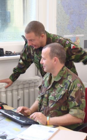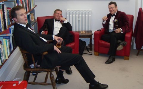 Solving the world's problems. Following the dinner, Colonel Lancashire, Lieutenant Colonel John Lighten, Commanding Officer 4th Battalion The Duke of Lancaster's Regiment and Major David Cook pull up a few sand bags following a raid on the Area Secretary's drinks cabinet