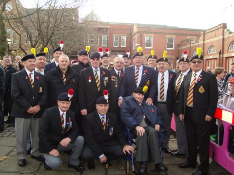 Fusiliers gather around Joe Trafford former long time chairman of the Salford Branch, at the Lancashire Fusilier Memorial in Salford to commemorate Remembrance Sunday