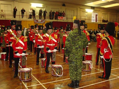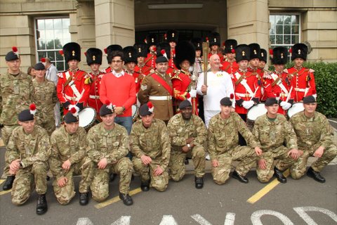 Olympic Torch. The Regiment was invited by Bury Council to play a part in the reception of Olympic Torch when it came through Bury. The opportunity to execute a recruiting surge was seized 1RRF and as a consequence the Drums Platoon was despatched to Bury to support the local team. After eight weeks in Canada and no leave, the home team really did appreciate what the 1RRF Drums contributed to the event. Stationed at the Town Hall, they did a superb job entertaining the crowd and providing a reception party for the Torch. It goes without saying that they attracted considerable media attention and were first class ambassadors for the Regiment. It so happened that a couple were getting married in the Town Hall as the torch arrived and as the married couple emerged they were confronted by the Olympic Torch and the Drums, a frightening prospect at the best of times. The Drum Major ever the opportunist volunteered the Drums to play at the wedding reception with a repeat performance for the Mayor of Bury and her guests. In addition to the 1st Battalion Corps of Drums, the regimental family in Bury played a part with Fusilier Cadets lining the route through Bury and volunteers from the Fusilier Band entertaining the crowds outside the Parish Church.