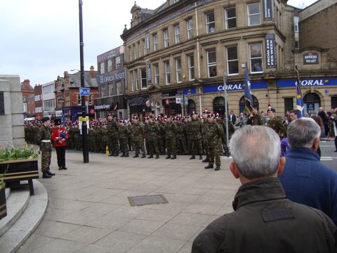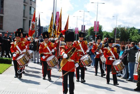 the Fusilier Boer War Memorial or the "Shouting Fusilier" as it is known by the locals, was rededicated in Salford. The event marked the completion of the initial regeneration of the Chapel Street area. Chapel Street was once the heart of old Salford and to this day features two Lancashire Fusilier Memorials. Chapel Street also leads to Sacred Trinity Church which is the Regimental Church in Salford. The memorial has been refurbished and site has been turned into a piazza. The rededication ceremony proved to be another family event, with serving Fusiliers, cadets and veterans on parade. The Mayor of Salford presided and the event was attended by the local MP as well as eight local councillors. The reinvigorated Salford Branch also took the opportunity to dedicate their new standard. The icing on the cake was the presence of volunteers from the Lancashire Band who entertained the crowd throughout the event and a fine showing of volunteers from the Lancashire Corps of Drums who led the parade and turned an ordinary event into a military spectacle.