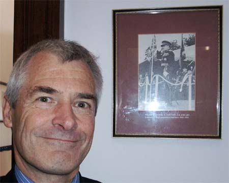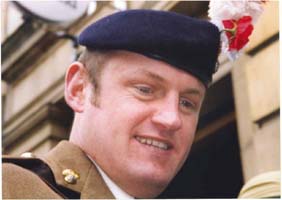 ![]() Capt Andy Harris Assistant Regimental Secretary standing next to a photo of his Grandfather Maj Gen Surtees in the Fusiliers Museum Bury |