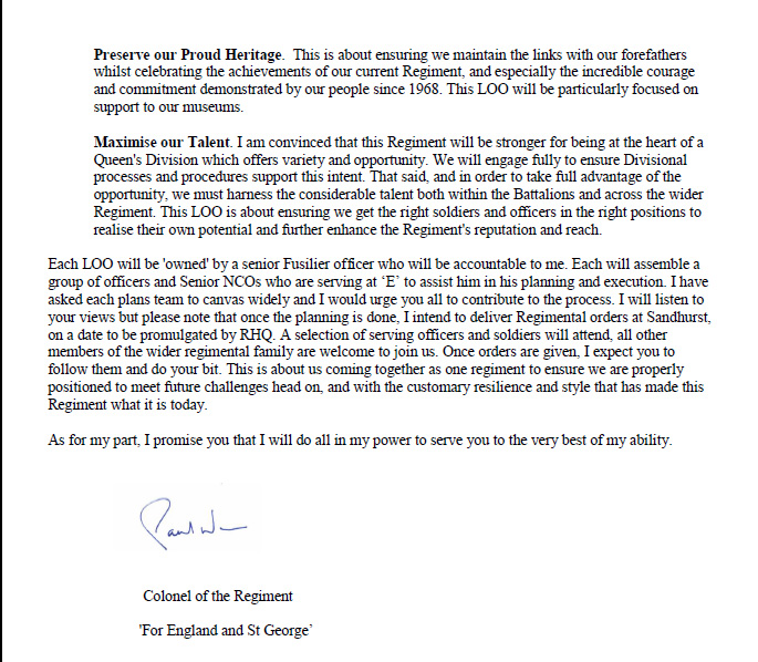 On behalf of all serving and veteran Fusiliers and their families and our Fusilier Cadet community, I want to publicly thank General Paul for the last 5 years as the Colonel of the Regiment. During his tenure both he and Lu have worked tirelessly on behalf of the Regiment. The Regiment is in good heart and recognised for its professionalism, dedication and doing things the Fusilier way. Our reputation and profile are very high across the Army and we are in a good position today to accept any challenges that come our way. The fact that we are in this position is down to the leadership and guidance that General Paul has provided. All members of the Regiment wish General Paul, Lu, Milly and Henry the very best for the future and for the new challenges ahead of them. Due to the Covid 19 restrictions the Regiment has not be able to formally thank and say farewell to General Paul and Lu. Once the Covid 19 situation becomes clearer it is intended to have a formal farewell to both General Paul and Lu. Col JW Denny MBE, Regt Sec